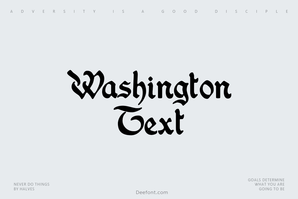 Washington Text is a classic blackletter font featuring intricate, ornate details that evoke historical elegance. This gothic typeface showcases sharp, angular lines and dramatic flourishes in uppercase letters combined with more rounded, yet elaborate lowercase characters. Ideal for certificates, invitations, historical documents, branding projects requiring vintage or medieval aesthetic. The font demonstrates exceptional character consistency and decorative appeal suitable for headlines and logos seeking a touch of sophisticated vintage sophistication.
