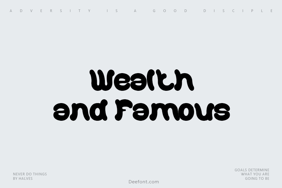 Wealth and Famous is a bold and playful display font featuring thick, rounded strokes that create a whimsical and energetic appearance. The font is highly stylized with exaggerated curves and bubbly characters, making it ideal for headlines, branding, party invitations, and creative posters. Its distinctive design captures attention and conveys a lively, fun vibe suitable for projects requiring creativity and flair.