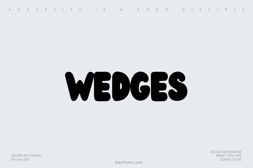 Wedges is a playful and energetic sans serif font featuring rounded letterforms and friendly character design. This versatile typeface brings a sense of fun and charm to your creative projects with its modern aesthetic. Perfect for posters, packaging, children’s books, and social media graphics, the font offers both uppercase and lowercase letters along with comprehensive punctuation and symbols. Its soft, approachable appearance creates engaging typography that adds lightheartedness and whimsy to any design composition.