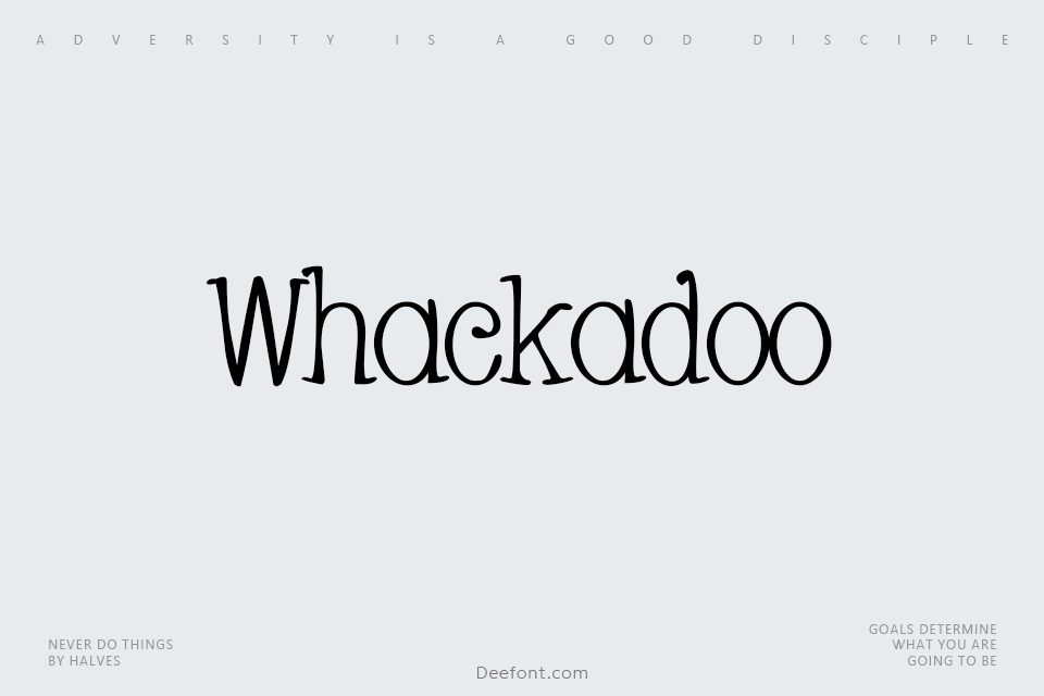 Whackadoo Font is a playful and quirky decorative typeface featuring gentle, rounded letterforms with understated serifs that create a whimsical yet readable design. Perfect for titles and headings where personality and informal charm are desired, this font combines friendly informality with clean aesthetics, making it ideal for creative projects that demand a touch of fun and uniqueness in typography.