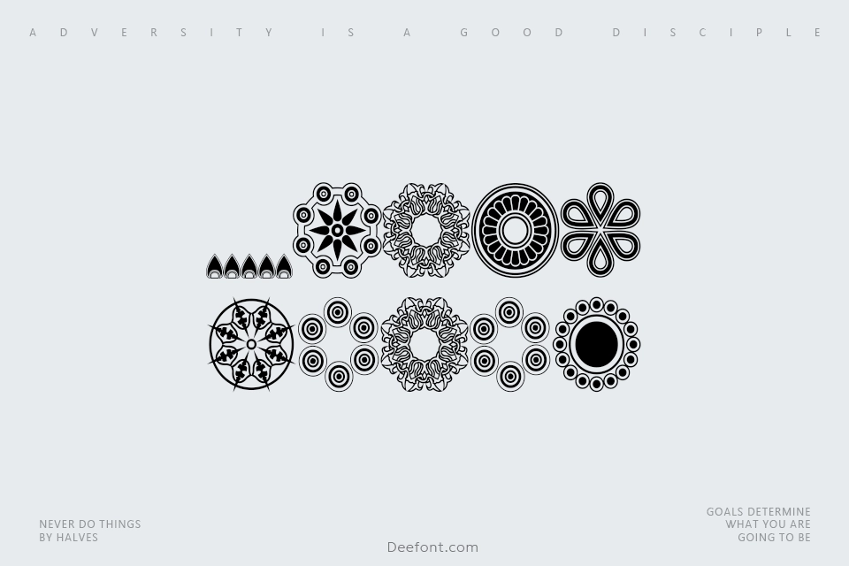 Whirlygigs is a decorative dingbat font featuring intricate spirals, mandalas, and geometric patterns inspired by ancient cultural designs. This typeface offers three to six-sided symmetry with ornamental shapes perfect for embellishments, borders, and decorative elements in graphic design projects. Each character provides unique swirling patterns that align seamlessly, making it ideal for creating textures and background designs.