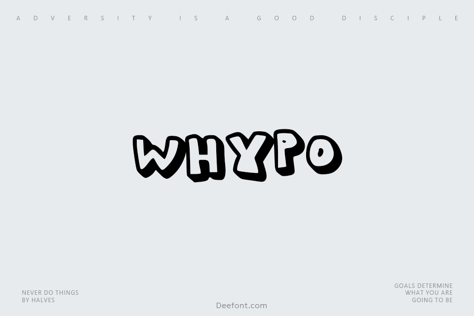 Whypo is a playful and bold display font featuring a cartoonish style with thick, rounded edges and a three-dimensional shadow effect that gives it a dynamic, lively appearance. The uppercase letters are prominent with slightly irregular forms, adding to its whimsical charm. With 135 carefully crafted characters and excellent spacing, Whypo excels at capturing attention and conveying fun and creativity. Ideal for children’s books, comic strips, playful branding, event posters, and any project requiring a touch of humor and lightheartedness.