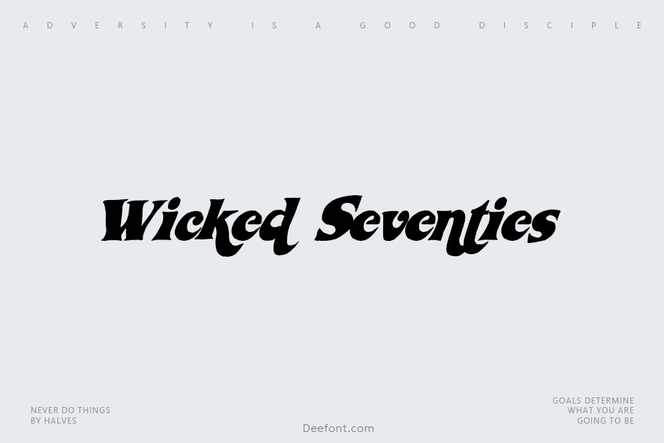 Wicked Seventies is a vibrant retro display font that captures the bold, groovy essence of 1970s design. With its distinctive curves and eye-catching letterforms, this donationware typeface brings authentic vintage flair to posters, album covers, headlines, and creative branding projects. Perfect for designers seeking nostalgic aesthetics and groovy typographic impact.