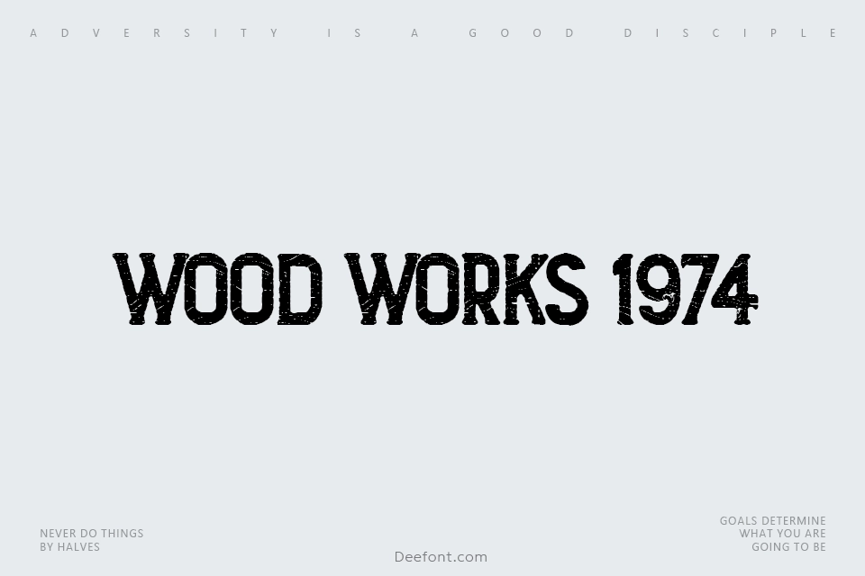 Wood Works 1974 is a bold, textured display font with a vintage woodblock printing aesthetic. Featuring robust, slightly distressed characters that evoke a handcrafted, rustic feel, this typeface combines nostalgia with contemporary design. The eroded texture adds depth and visual interest, making it ideal for posters, branding, packaging, and headlines. Its strong personality and distinctive appearance bring character to any creative project requiring an authentic, vintage charm that stands out from conventional typography.