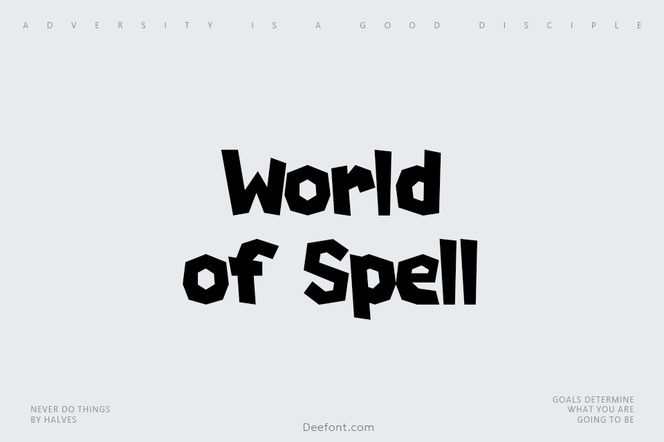 The World of Spell font is a playful display typeface that brings a whimsical, fantasy-inspired feel to your designs. Perfect for game titles, children’s book covers, cartoons, and branding projects, this font showcases bold curves and dynamic styling that grab attention instantly. Its distinctive lettering style adds a touch of magic and storytelling charm, making it a great choice for creative professionals who want to infuse their work with fun and uniqueness. World of Spell stands out in posters, logos, and invitations, elevating any project that calls for a lively and engaging visual impact.