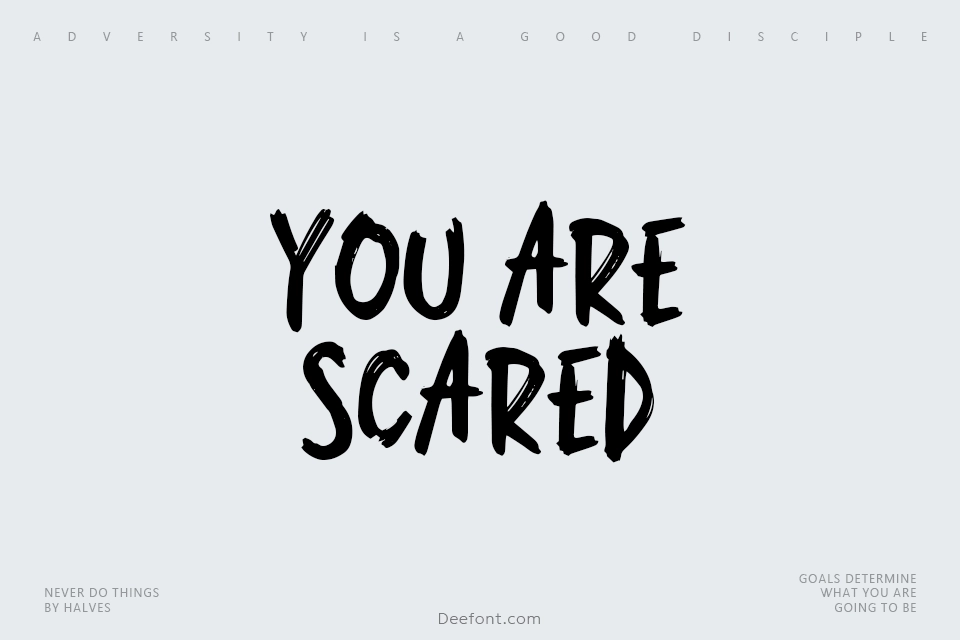 You Are Scared is a striking horror-themed display font designed to evoke an unsettling atmosphere through its irregular letterforms and jagged edges. Perfect for Halloween designs, horror movie titles, game graphics, and creepy promotional materials, this eye-catching typeface combines dramatic distortions with a distinctly eerie aesthetic that demands attention and creates immediate visual impact for any spine-chilling project.