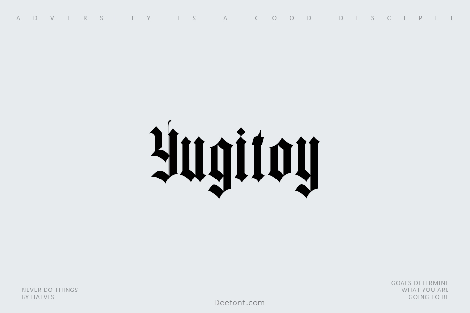 Yugitoy is a unique, vintage, and elegant decorative typeface featuring a gothic and modern style inspired by victorian aesthetics and vintage tattoo design. With its romantic and bold formation alongside meticulous attention to detail, Yugitoy delivers a playfully nostalgic aesthetic perfect for creating eye-catching designs. The font includes multilingual support with uppercase and lowercase letters, numbering, punctuations, alternates, and ligatures, making it an outstanding choice for branding, packaging, and contemporary creative projects seeking a distinctive vintage aesthetic.